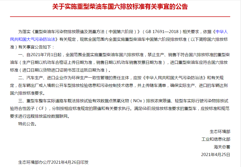 2021年4月26日,**生態(tài)環(huán)境部、工業(yè)和信息化部、海關(guān)總署印發(fā)《關(guān)于實施重型柴油車國六排放標(biāo)準(zhǔn)有關(guān)事宜的公告》(公告 2021年 第14號)。