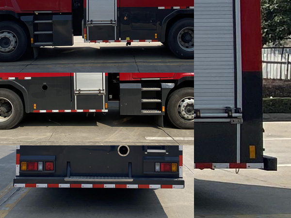 其它:罐體總?cè)莘e為6.600立方米,水罐尺寸:2390×2400×1200mm。整體式側(cè)防護(hù)結(jié)構(gòu),后防護(hù)裝置材料:Q235A,截面尺寸:100×120mm,與車輛連接方式:螺栓連接,后防護(hù)離地高度:398mm,ABS生產(chǎn)企業(yè)為浙江亞太機(jī)電股份有限公司,型號為APG3550500H1。主要專用裝置有消防泵、消防炮。